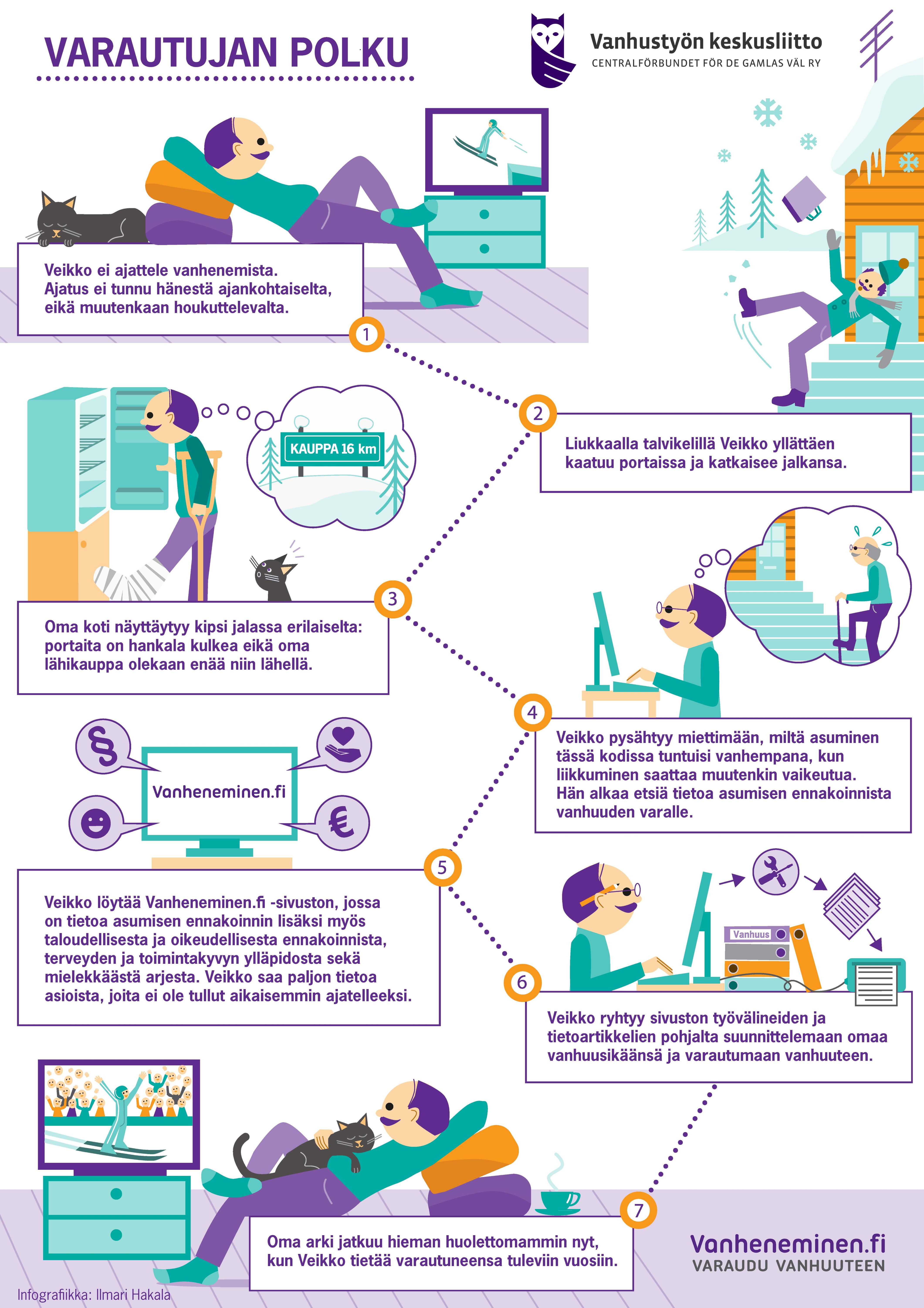 Beredskaparens väg är en modell för kundförståelse som utvecklats inom projektet Vanheneminen.fi. Modellen baserar sig på den kunskap som samlats in i projektet samt på teorier om beteendeförändring. Infografin beskriver exempelpersonen ”Veikos” resa från insikt till medveten beredskap inför ålderdomen